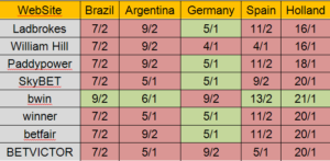 Well, if you took five seconds to actually look at the chart, there is something very clear here. For the time being, bwin offers you the best odds on most of the teams. For Brazil, Argentina, Spain, and Holland bwin offers the absolute best odds for you who seek to bet on any of these teams. However, if it’s Germany that you wish to bet on, then Ladbrokes, Paddypower, SkyBET, winner, and Betfair offer you the best odds.